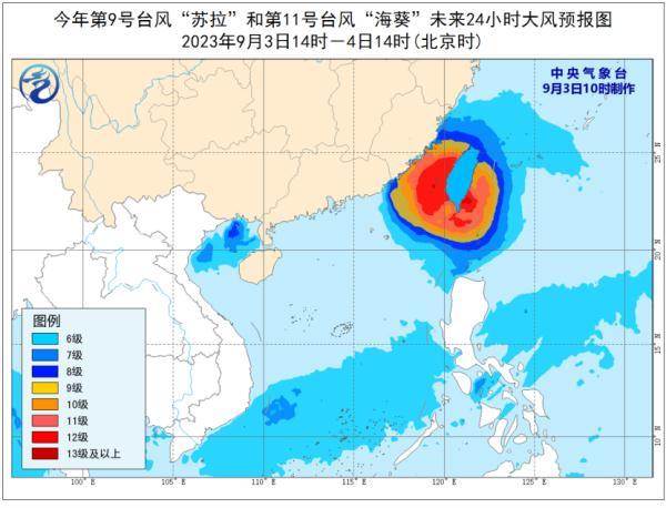 大風預報:9月3日14時至4日14時,受“蘇拉”影響,北部灣和廣西南部沿海將有6-7級大風,其中北部灣北部部分海域將有8級、陣風9-10級的大風;受“海葵”影響,巴士海峽、臺灣海峽、臺灣以東洋面、東海南部及釣魚島附近海域、南海東北部偏東海域以及浙江南部沿海、福建沿海、廣東東部偏東地區沿海、臺灣島沿海將有6-8級、陣風9-10級大風,部分海域或地區的風力有9-12級,陣風13-14級,“海葵”中心經過的附近海面或地區的風力有13-16級,陣風16-17級。