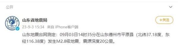 山東地震臺網測定:09月03日14時35分在山東德州市平原縣(北緯37.18度,東經116.38度)發生M2.8級地震,震源深度20公里。