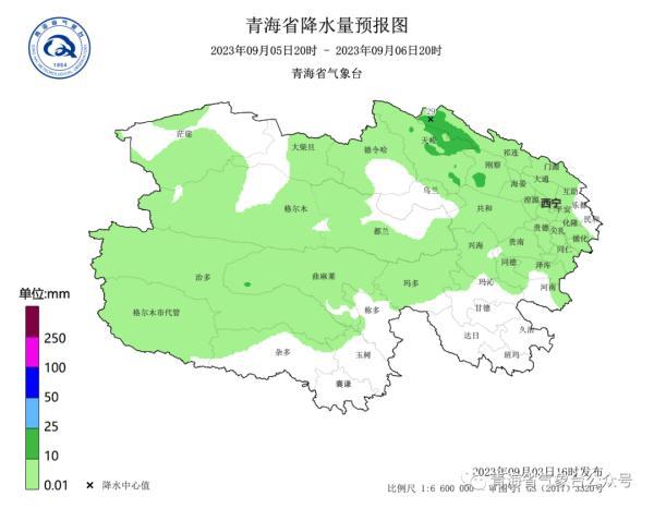 9月5日20時~9月6日20時:西寧、海東大部、海北、海西大部、海南、黃南大部、玉樹西部、果洛北部有小雨或陣雨,其中天峻、祁連、剛察的部分鄉鎮有中雨,省內其余地區晴或多云。