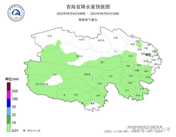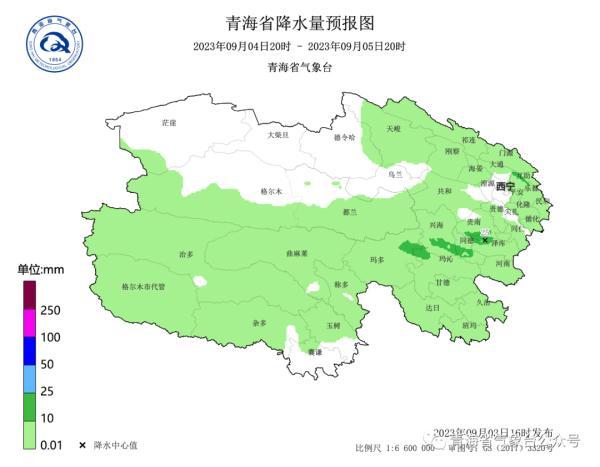 9月4日20時~9月5日20時:西寧北部、海東、海北、海西東部、海南大部、黃南大部、玉樹大部、果洛有小雨或陣雨,其中互助、貴南、同德、興海、澤庫、瑪多、瑪沁的部分鄉鎮有中雨,省內其余地區晴或多云。
