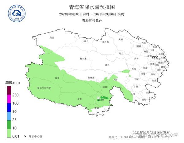 9月3日20時~9月4日20時:今天夜間,玉樹大部及瑪多、達日有小雨或陣雨,其中稱多、玉樹市的部分鄉鎮有中雨,省內其余地區晴或多云。明天白天,海南大部、黃南南部、玉樹大部、果洛及都蘭、格爾木市有小雨或陣雨,省內其余地區晴或多云。