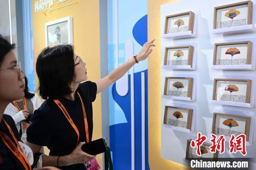 8月31日,媒體記者在2023年服貿會首鋼園展區觀看京派葉畫。中新社記者 田雨昊 攝