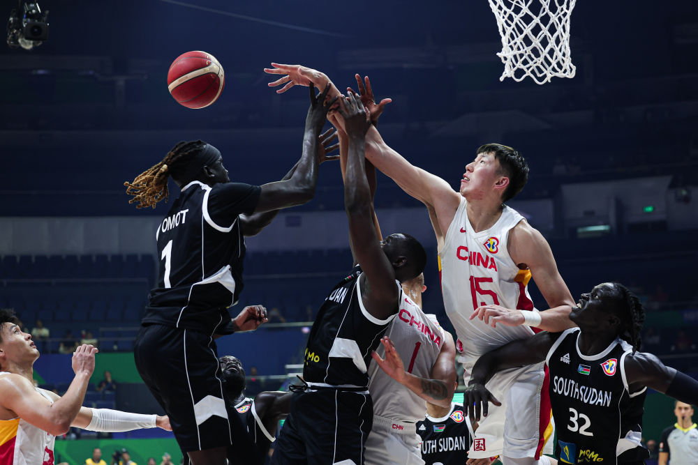 8月28日,中國隊球員周琦(右二)在比賽中拼搶。當日,在菲律賓馬尼拉舉行的2023年籃球世界杯B組小組賽中,中國隊以69:89不敵南蘇丹隊。新華社記者 吳壯 攝