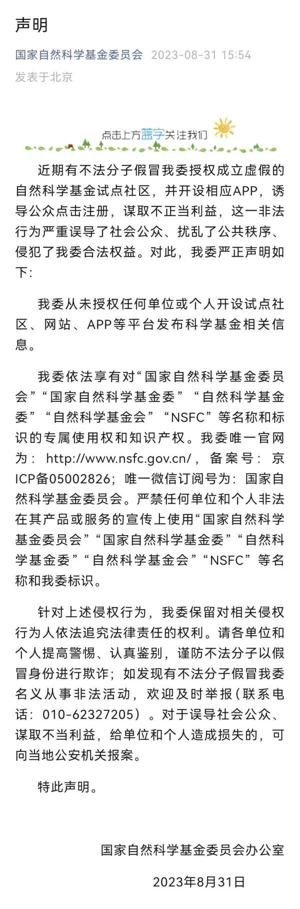 8月31日,就在事件得到圓滿解決的第二天,國家自然科學基金委員會在其官方平臺發布了一則聲明,證實該事件所涉及“國家自然基金”APP為詐騙軟件。