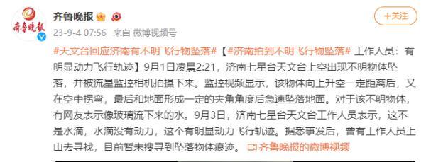 9月3日,濟南七星臺天文臺工作人員表示,這不是水滴,水滴沒有動力,這個有明顯動力飛行軌跡。據(jù)悉事發(fā)后,曾有工作人員上山去尋找,目前暫未搜尋到墜落物體痕跡。