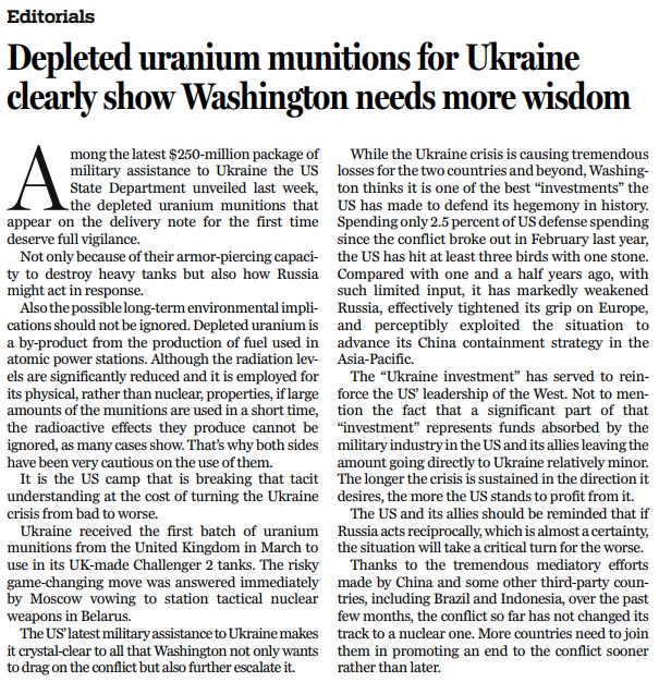 其次,貧鈾彈對環(huán)境的長期危害不容忽視。貧鈾是用于制造核燃料或核武器的核濃縮過程中的副產(chǎn)品,雖然其輻射水平相對較低,但若在短期內(nèi)大量使用仍會造成嚴(yán)重危害。因此,任何一方都要三思而后行。遺憾的是,美西方打破了這種不使用貧鈾彈的默契,不惜讓烏克蘭危機愈演愈烈。