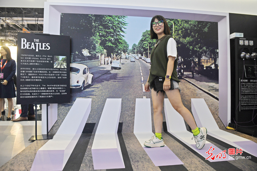 9月3日,國(guó)家會(huì)議中心綜合展區(qū)英國(guó)展館,游客在披頭士打卡墻留影。(光明網(wǎng)記者 潘迪攝/光明圖片)