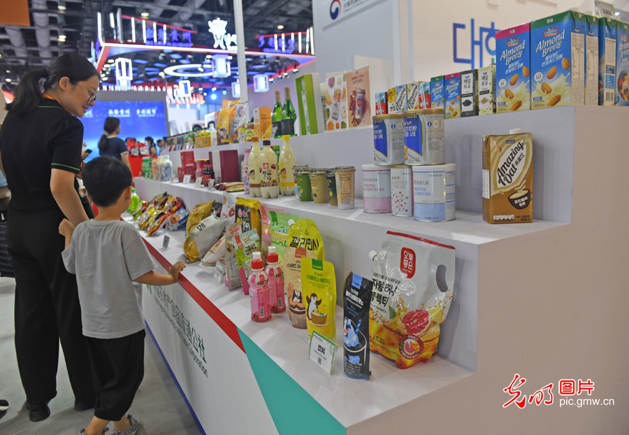 9月3日,國(guó)家會(huì)議中心綜合展區(qū)韓國(guó)展館,游客從琳瑯滿目的零食前走過(guò)。(光明網(wǎng)記者 潘迪攝/光明圖片)