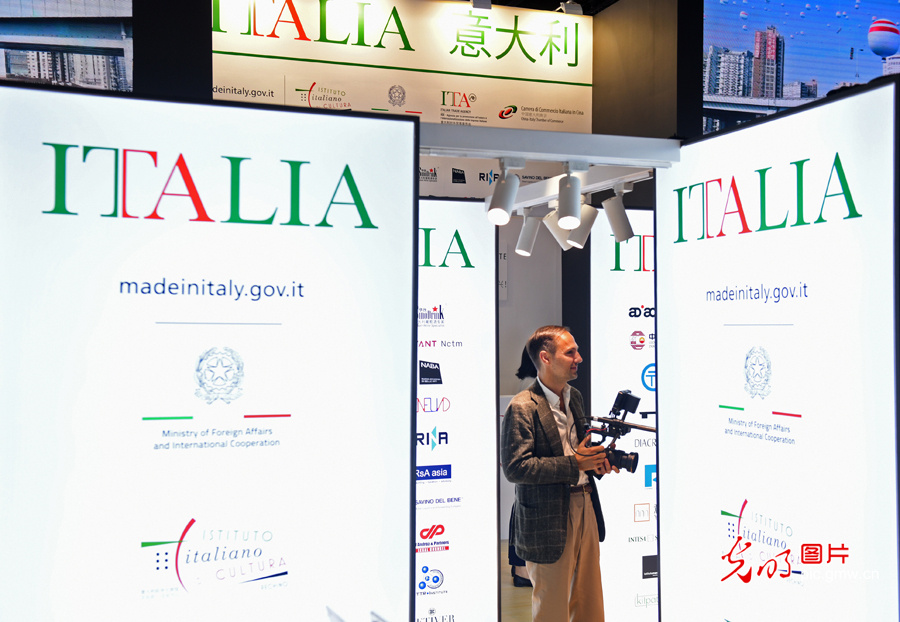 9月3日,國(guó)家會(huì)議中心綜合展區(qū)意大利展館,一名外國(guó)媒體在拍攝報(bào)道。(光明網(wǎng)記者 潘迪攝/光明圖片)