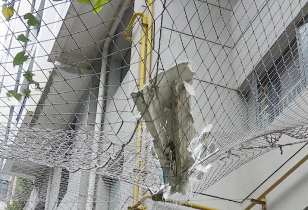 在小區內部記者看到,業主們自行鋪設的安全網上還有許多脫落下來的石膏板。