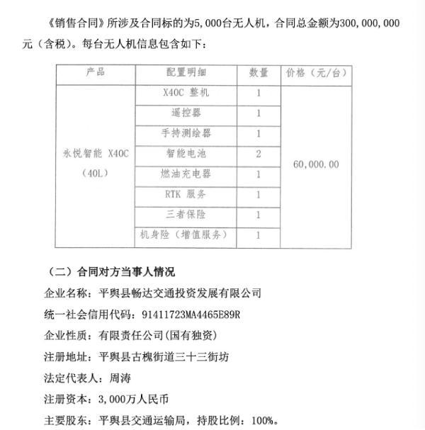8月28日,永悅科技股份有限公司(以下簡(jiǎn)稱:永悅科技)發(fā)布《關(guān)于簽訂重大合同的公告》,公告顯示,其全資子公司鹽城永悅智能裝備有限公司(以下簡(jiǎn)稱:鹽城永悅)與平輿縣暢達(dá)交通投資發(fā)展有限公司(以下簡(jiǎn)稱:平輿暢達(dá))于2023年8月27日簽訂了一份總金額3億元的《銷售合同》,所涉及合同標(biāo)的為5000臺(tái)無人機(jī)。