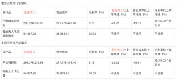 《永悅科技股份有限公司2022年年度報(bào)告》顯示,2022年度永悅科技實(shí)現(xiàn)營(yíng)業(yè)收入約2.963億元,其主營(yíng)業(yè)務(wù)中化學(xué)制品制造業(yè)收入約2.961億元,智能無人飛行器制造業(yè)收入僅約為5.49萬元。