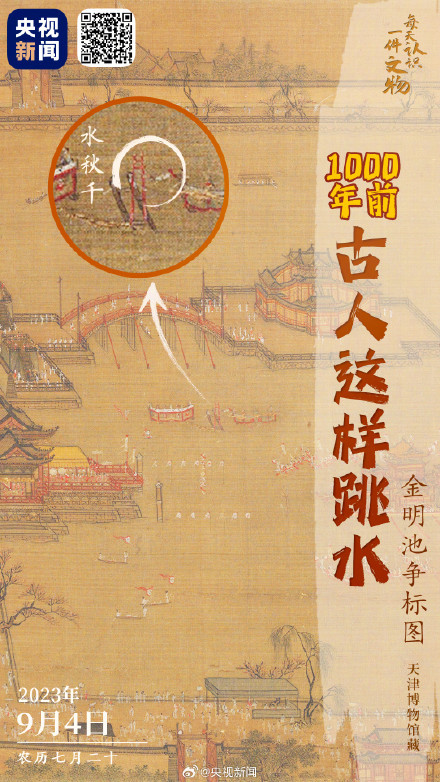 最近,天津“掰掰”的花式跳水引發熱議。早在千年前,古人就對跳水上頭了。“水秋千”是古時的一種跳水運動,“運動員”在船上將秋千蕩高,縱身一躍,完成花式動作入水。