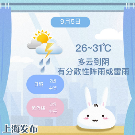 申城今天多云到陰有分散性陣雨或雷雨,降水依然隨機出現,出行還是要帶好雨傘。氣溫26~31℃,東北風3~4級。