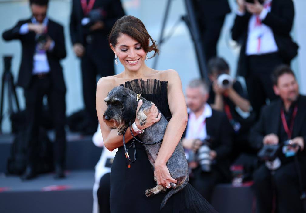 9月1日,在意大利威尼斯,演員卡泰麗娜·穆里諾抱著寵物狗亮相電影《可憐的東西》首映式紅毯。新華社記者 金馬夢妮 攝