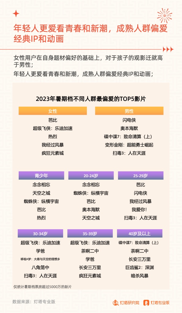 同日,燈塔研究院聯合新華網發布《長風破浪,勢不可擋——2023年暑期檔電影市場洞察報告》,從市場大盤、用戶畫像、競爭格局、重點影片、城市影院等五大維度進行復盤分析。從分析報告看,暑期檔表現強勁,三個“多”讓人們對電影市場后續的表現充滿期待。