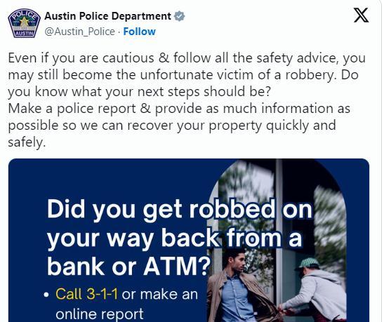奧斯汀警方在社交媒體推特上發文說,居民被搶劫后可以撥打311或進行線上報告。311是一個通常用于非緊急投訴的號碼。奧斯汀警察局寫道:“即使你很小心并遵循了所有安全建議,仍然有可能成為不幸的搶劫案受害者。報警時提供盡可能多的信息,這樣我們才能快速追回你的財產。”警方還建議在撥打311時提供具體銀行,注明取錢的日期和時間。
