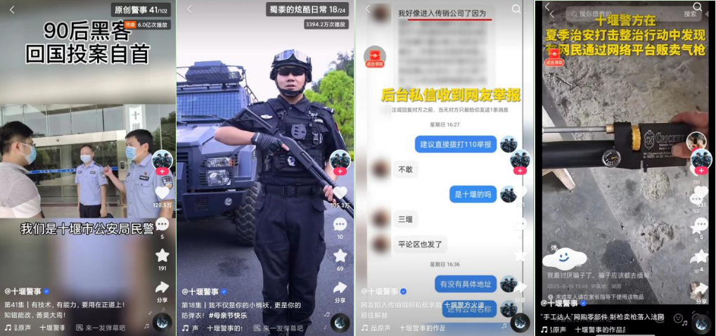 “十堰警事”快手號聚焦十堰公安工作日常,推出了一批群眾喜聞樂見,民警叫好點贊的高質量、正能量作品,至今發布772條原創短視頻,瀏覽量超10億次。原創欄目《蜀黍的炫酷日常》《原創警事》《小李小楊小課堂》累計連載156集,播放量破7億次。堅持執法為民、服務為先,評論答復、私信答復網友提問1300余次,扎扎實實地為人民服務,還根據群眾提供的線索制作出許多典型案例,如《網友陷入傳銷組織私信求助 十堰警方火速前往解救》《“手工達人”網購零部件 制槍賣槍落入法網》等,樹立了良好公安形象,構建了和諧警民關系。