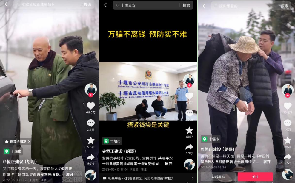 作為粉絲量超700萬的湖北省正能量網絡大V和全國最受歡迎職工網絡達人,抖音賬號“恒正建設(胡哥)”以“傳播正能量,守護社會公德”為初心,聚焦基層群眾以小見大,積極推動輿論關注民生話題。很多短劇內容根據真實故事改編而成,團隊實地取材走訪,也為基層鄉村社區送去溫暖關懷。同時,緊跟各級主管部門的步伐,發揚新時代網絡自媒體戰線的主人翁精神,為基層社會治理貢獻力量,在十堰市公安部門的指導下,聯合拍攝“反電信詐騙”系列視頻獲得眾多網民喜愛,并組織參與了數場線下反電詐公益宣傳。獨具特色的警民攜手反電詐,視頻在基層群眾中反向熱烈傳播迅速。