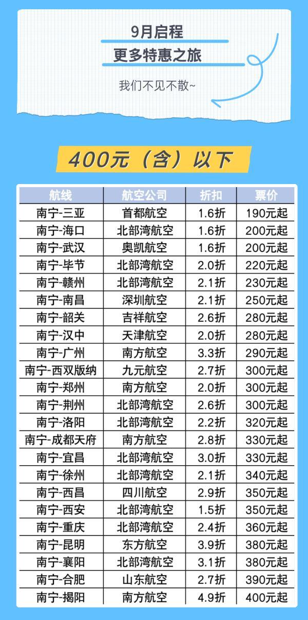 近期,南寧始發多地有折扣機票,即日起至9月10日,南寧—三亞航線機票票價190元起,南寧—海口、南寧—武漢200元起,南寧—西雙版納、南寧—鄭州、南寧—荊州300元起,南寧—長沙、南寧—杭州410元起……對于想錯峰外出賞秋的旅客,9月是出行的好季節。