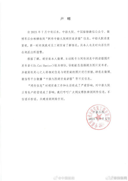 針對“網傳中船九院胡世南虐貓”事件,@中國船舶 發布聲明