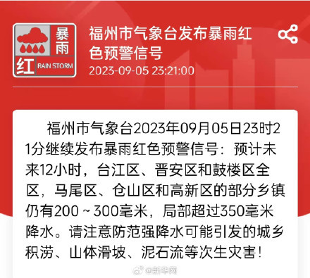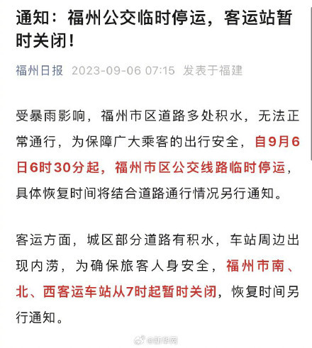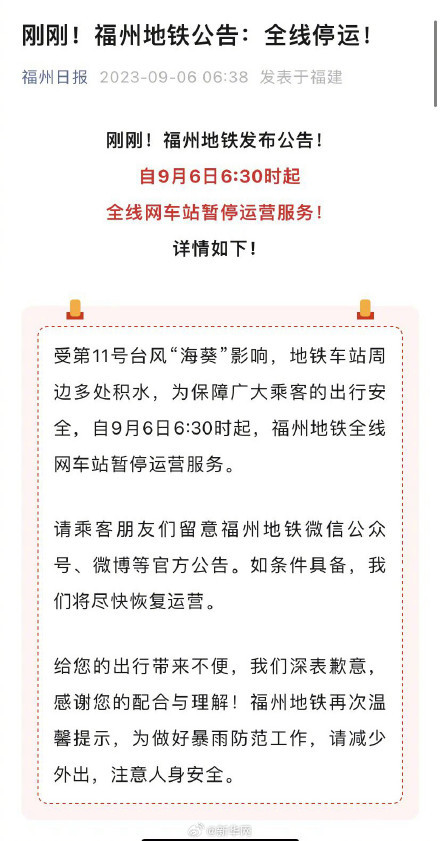 5日晚23時21分,福州再發紅色暴雨預警,注意防范強降水可能引發的次生災害!受第11號臺風“海葵”影響,地鐵車站周邊多處積水,自9月6日6:30時起,福州地鐵全線網車站暫停運營服務。受暴雨影響,福州市區道路多處積水,無法正常通行,為保障廣大乘客的出行安全,自9月6日6時30分起,福州市區公交線路臨時停運,具體恢復時間將結合道路通行情況另行通知。客運方面,城區部分道路有積水,車站周邊出現內澇,為確保旅客人身安全,福州市南、北、西客運車站從7時起暫時關閉,恢復時間另行通知。(福州日報)