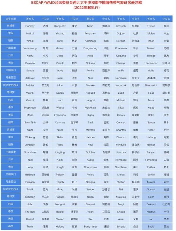 市氣象服務中心說,臺風由14個國家和地區各選10個名字循環使用,部分造成惡劣災害的臺風還有可能被除名。目前,中國大陸提供的10個名字分別是海葵、銀杏、風神、杜鵑、木蘭、悟空、白鹿、海神、電母、海棠。其中,“木蘭”取代了被除名的“海馬”;“白鹿”取代了被除名的“海燕”;“銀杏”取代被除名的“玉兔”。