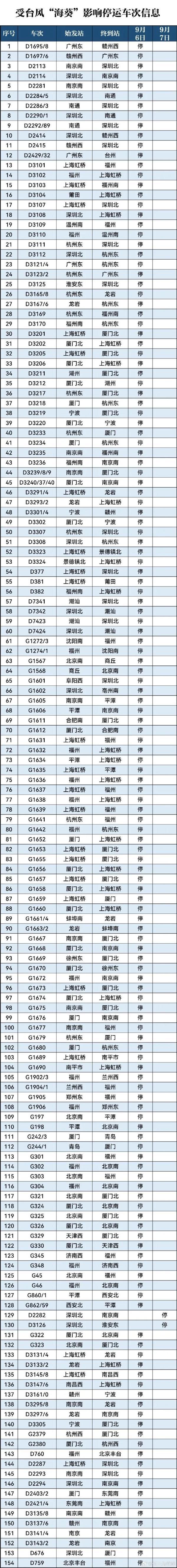 中國鐵路上海局集團有限公司提示,受“海葵”殘余環流影響,預計9月6日08時至7日08時,福建東部和南部、廣東中東部、江西南部等地部分地區有大到暴雨。為防范暴雨影響,確保旅客列車運輸絕對安全,鐵路部門計劃對受到影響線路的部分列車采取停運措施。截至6日6時,計劃停運9月6日至9月7日間共154趟旅客列車。