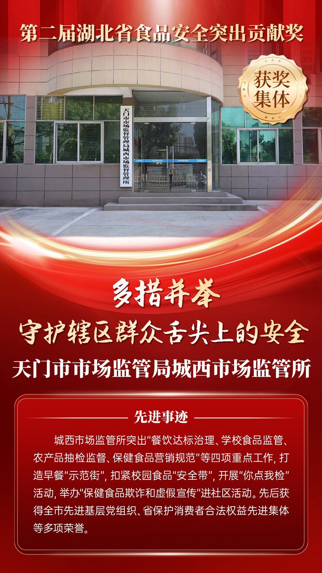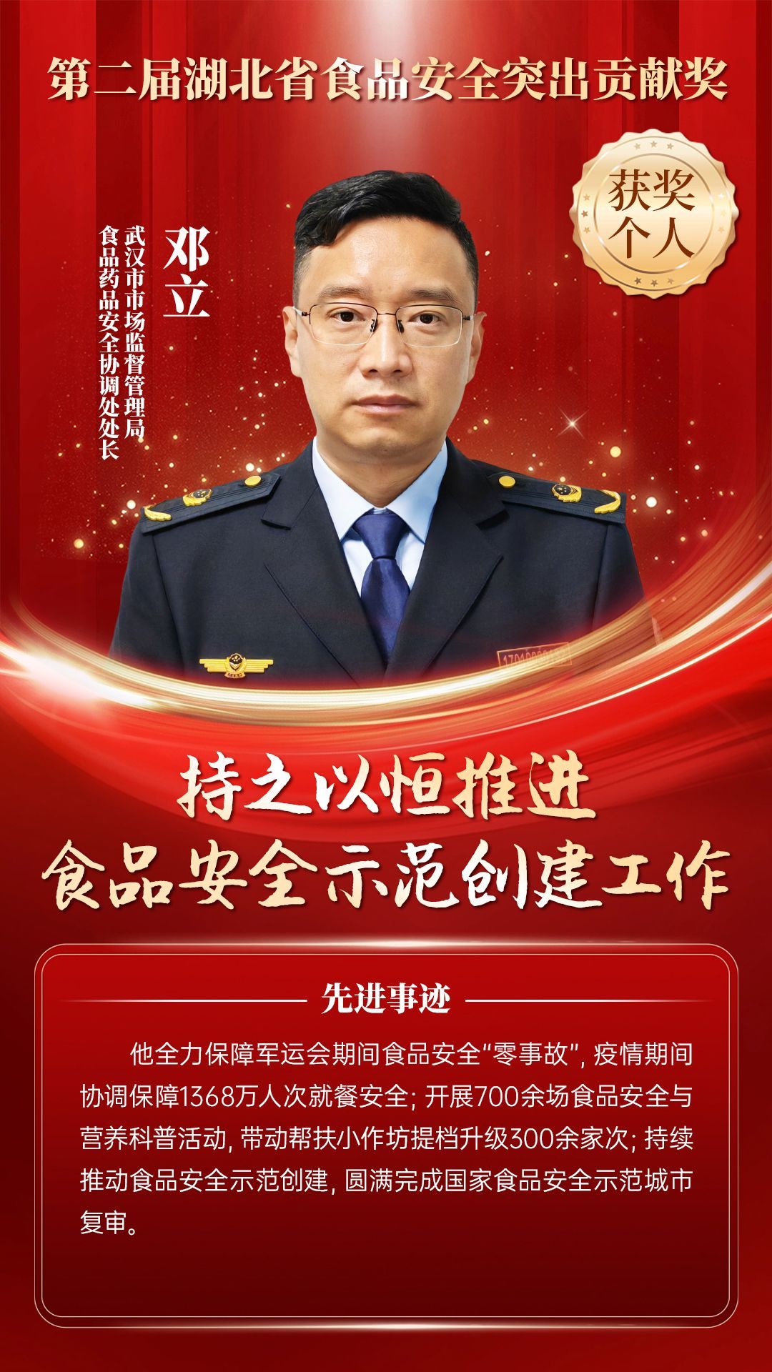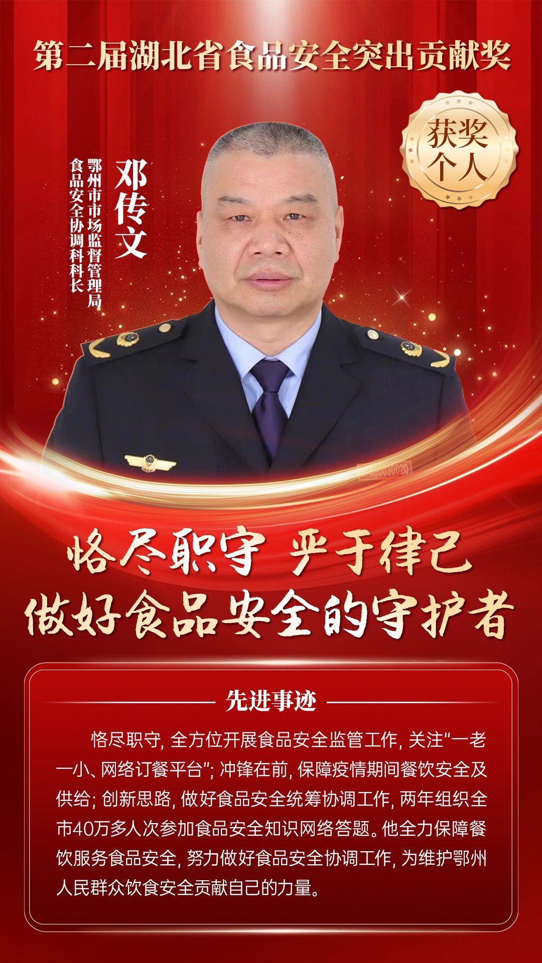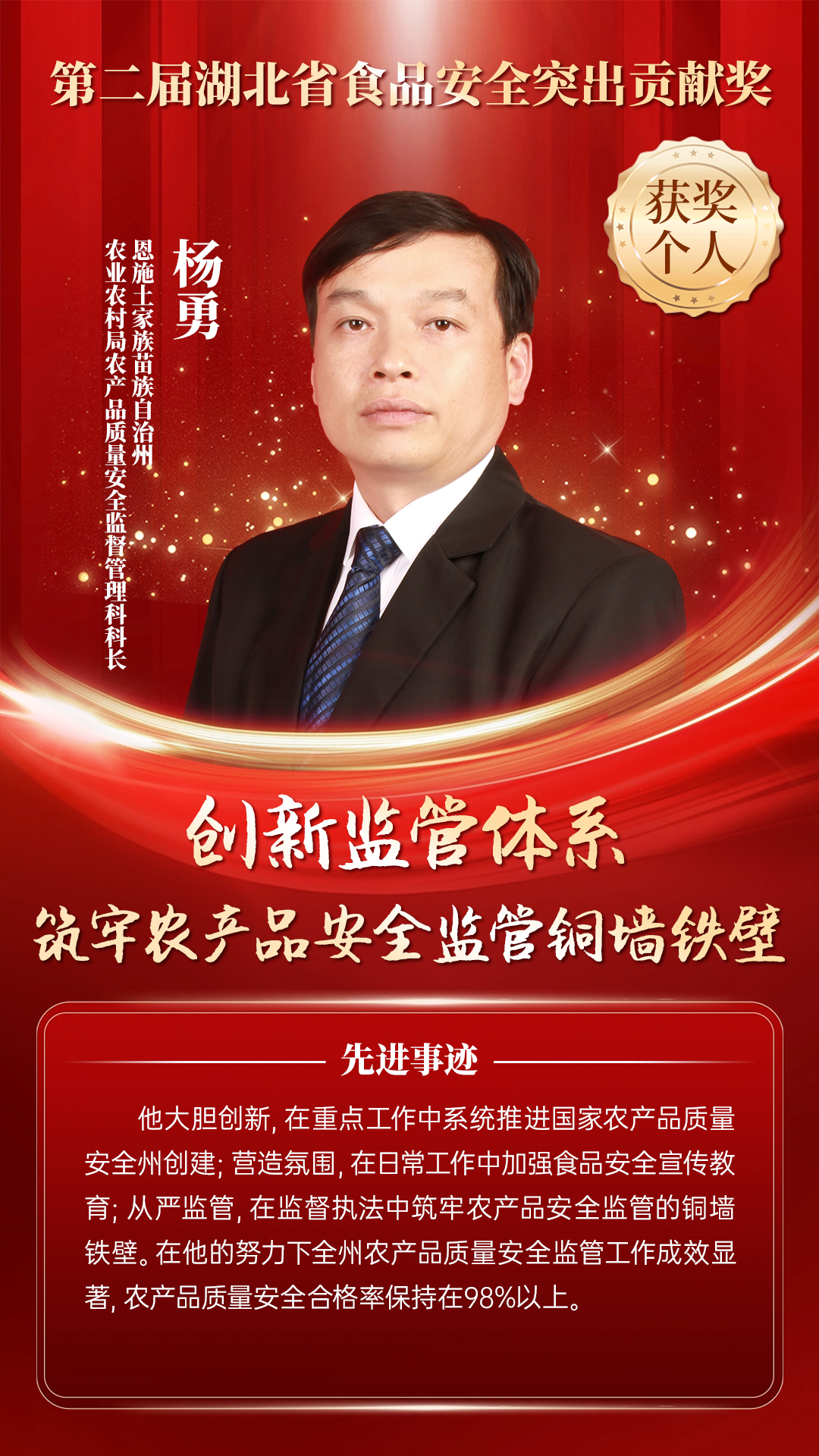 湖北省食品安全突出貢獻獎,是中央評先表彰辦公室批準的全國唯一一個以“食品安全”命名的省級政府獎,自2021年設立以來,每三年評選一次。該獎項主要面向食品安全工作基層一線,旨在表彰先進典型,激勵全省食品安全工作戰線開拓進取、勇于擔當、勤勉工作,不斷提高食品安全保障水平和治理能力,堅決筑牢食品安全底線,全力保障人民群眾“舌尖上的安全”。