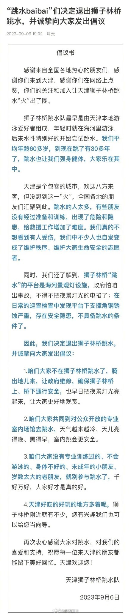 “我們真的不想看到有人受傷?!?月6日,天津獅子林橋跳水隊發布倡議書,宣布決定退出獅子林橋跳水,并誠摯向大家發出倡議:“咱們大家不在獅子林橋跳水了?!?/p>