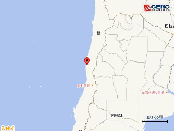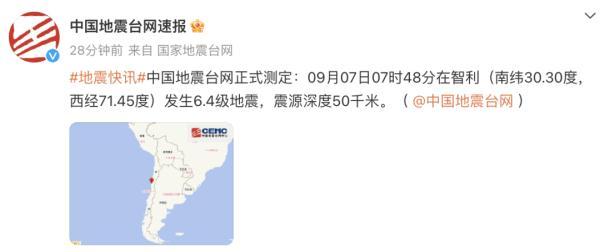 據中國地震臺網正式測定,北京時間9月7日7時48分(當地時間9月6日18時48分)在智利發生6.4級地震,震源深度50公里,震中位于南緯30.30度,西經71.45度。