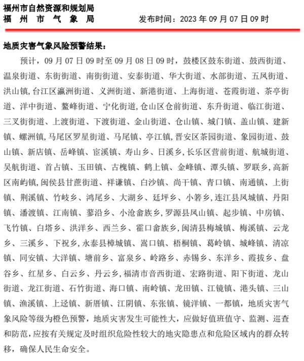 預(yù)計(jì)9 月 7 日 9 時(shí)至 9 月 8 日 9 時(shí),鼓樓區(qū)、臺(tái)江區(qū)、倉(cāng)山區(qū)、馬尾區(qū)、晉安區(qū)、高新區(qū)、閩侯縣、連江縣、羅源縣、閩清縣、永泰縣、福清市、長(zhǎng)樂(lè)區(qū)的 123 個(gè)鄉(xiāng)鎮(zhèn)、889 個(gè)村,地質(zhì)災(zāi)害氣象風(fēng)險(xiǎn)等級(jí)為橙色預(yù)警,地質(zhì)災(zāi)害發(fā)生可能性大,應(yīng)做好值班值守、監(jiān)測(cè)、巡查和防范,應(yīng)按有關(guān)規(guī)定及時(shí)組織危險(xiǎn)性較大的地災(zāi)隱患點(diǎn)和危險(xiǎn)區(qū)域內(nèi)的群眾轉(zhuǎn)移,確保人民生命安全。