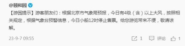 游客朋友們:根據北京市氣象局預報,今日有4級(含)以上大風,按照相關規定,根據氣象臺預警信息,今日小船12時停止售票。給您游覽帶來不便,敬請諒解。
