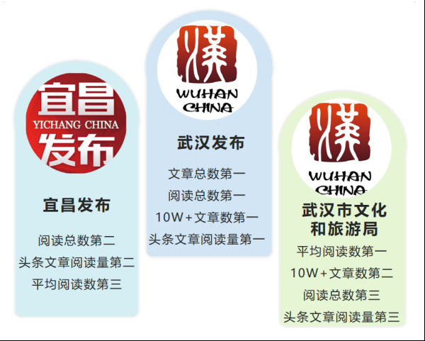 從閱讀總數來看,超一半以上賬號閱讀數量增長,共有60個賬號正向增長,較上期減少10個。其中,“武漢發布”閱讀總數797W+遙遙領先;“宜昌發布”閱讀總數293W+,位居第二;“武漢市文化和旅游局”閱讀總數167W+;此外,“十堰發布”“黃石發布”閱讀總數亦超百萬。
