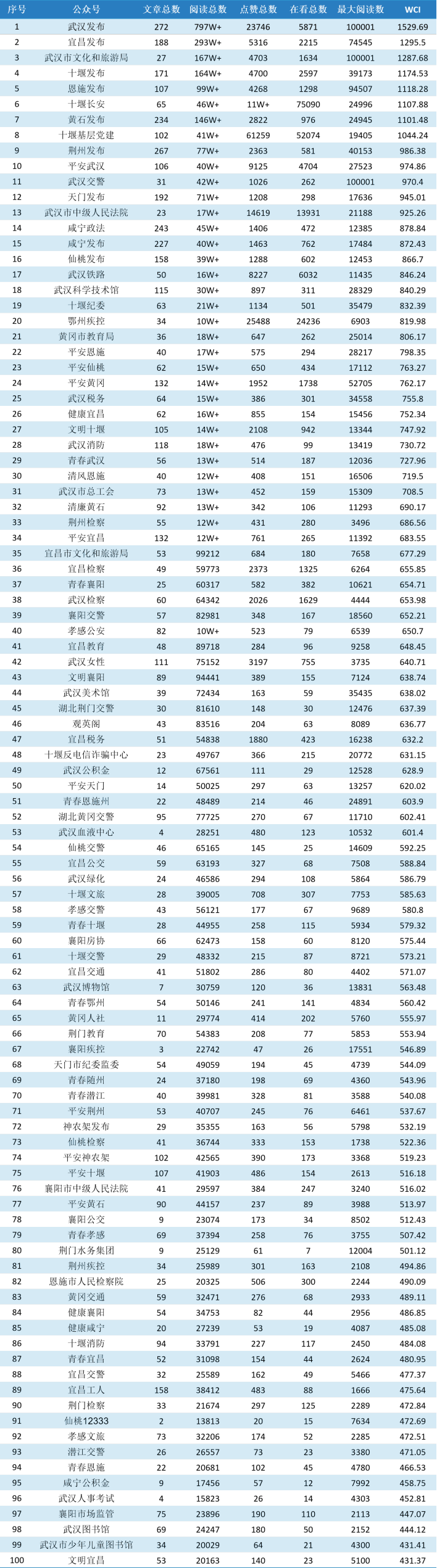 1、聚集湖北省內主要黨政機關政務微信公眾號,根據WCI指數數據進行科學排行,主要從“整體傳播力”、“篇均傳播力”、“頭條傳播力”、“峰值傳播力”四個維度進行評價。