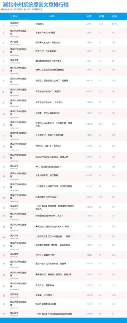 9月8日,由荊楚網(湖北日報網)、楚天輿情數據研究院制作的湖北市州微信排行榜2023年8月榜單發布,“武漢發布”穩居首位,“宜昌發布”重回第二位,“武漢市文化和旅游局”位居第三。