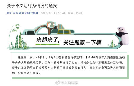 成都大熊貓繁育研究基地通報不文明行為:趙某某(女,49歲),9月7日在熊貓基地參觀時,于8:40向幼年大熊貓別墅活動場內(nèi)的大熊貓投喂竹筍。工作人員對其進(jìn)行了制止,并將雜物及時清理出室外活動場。鑒于趙某某的不文明參觀及對大熊貓可能造成危害的行為,終身禁止其再次進(jìn)入熊貓基地(含熊貓谷)參觀。