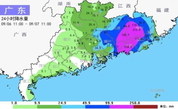 從9月6日8時到7日8時,全省超過25毫米雨量鎮街占全省總鎮街數的35.9%,有8個鎮街錄得超過250毫米的特大暴雨、119個鎮街錄得100毫米~250毫米的大暴雨、201個鎮街錄得50毫米~100毫米的暴雨,各市雨量最大的鎮街有:汕尾海豐縣黃羌鎮335.4毫米、梅州豐順縣湯西鎮277毫米、揭陽揭東區龍尾鎮246.3毫米、惠州惠東縣高潭鎮212.8毫米。