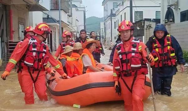 “海葵”殘余環流為廣東汕尾海豐帶來持續強降水,消防人員在內澇區域轉移群眾 圖自新浪微博@廣東天氣 陳亮、劉強、葉俊斌攝