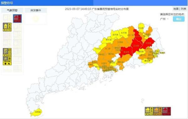 截至9月7日14時49分,紫金、五華、興寧、豐順等地暴雨紅色預警信號仍在生效;粵東、珠三角東部等地普遍發布暴雨黃色或以上預警信號。在廣州,從化發布暴雨黃色預警信號,增城發布分鎮街暴雨黃色預警信號,番禺發布分鎮街暴雨黃色和橙色預警信號。