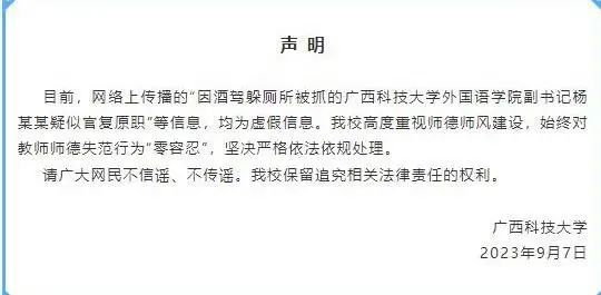 目前,網絡上傳播的“因酒駕躲廁所被抓的廣西科技大學外國語學院副書記楊某某疑似官復原職”等信息,均為虛假信息。我校高度重視師德師風建設,始終對教師師德失范行為“零容忍”,堅決嚴格依法依規處理。