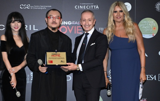 圖片說明:意大利文化部電影和視聽總局國際化顧問和特別項目負責人羅貝托·斯塔比勒(右2)向導演烏爾善(左2)和制片人羅珊珊(左1)在第80屆威尼斯電影節期間頒發最佳藝術貢獻獎。