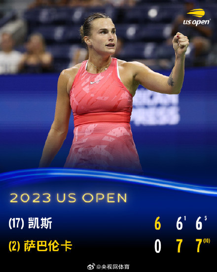 美網2023女單半決賽,今年澳網冠軍、2號種子薩巴倫卡在首盤吞蛋、次盤3-5和決勝盤2-4落后的情況下大逆轉,最終以0-6 7-6(1) 7-6(10-5)險勝17號種子凱斯,職業生涯首進美網單打決賽,第二次闖入大滿貫單打決賽。接下來,她將和本土寵兒高芙爭奪冠軍。