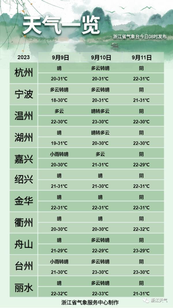 8 日(周五):全省多云,其中浙西南和沿海地區(qū)局部有陣雨。
