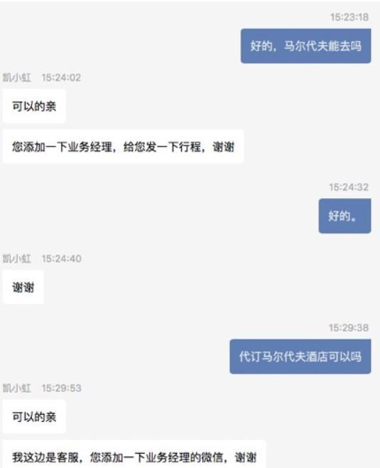 記者通過凱撒國旅官網詢問是否有馬爾代夫游、是否可以代訂馬爾代夫酒店,在線客服“凱小虹”表示“都可以”。