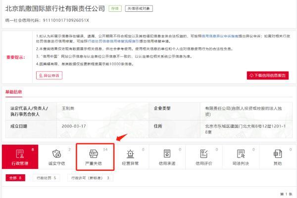 記者通過信用中國查詢了解到,凱撒國旅仍處存續階段,但已進入失信企業名單,共有34條嚴重失信紀錄。
