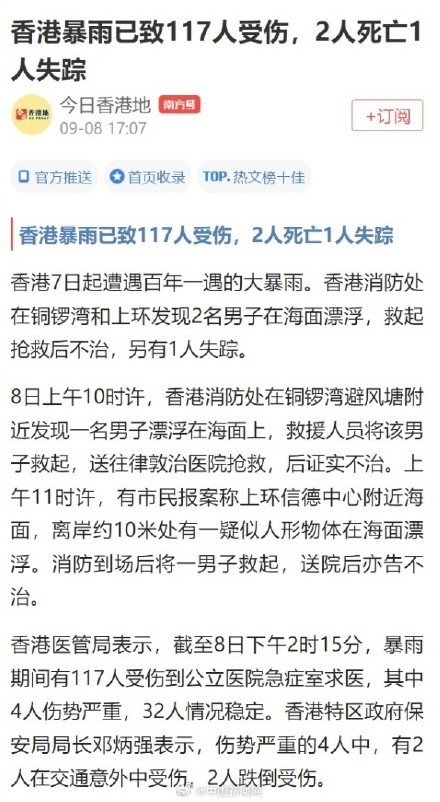 香港7日起遭遇百年一遇的大暴雨。香港消防處在銅鑼灣和上環發現2名男子在海面漂浮,救起搶救后不治,另有1人失蹤。香港醫管局表示,截至8日下午2時15分,暴雨期間有117人受傷到公立醫院急癥室求醫,其中4人傷勢嚴重,32人情況穩定。(南方+)