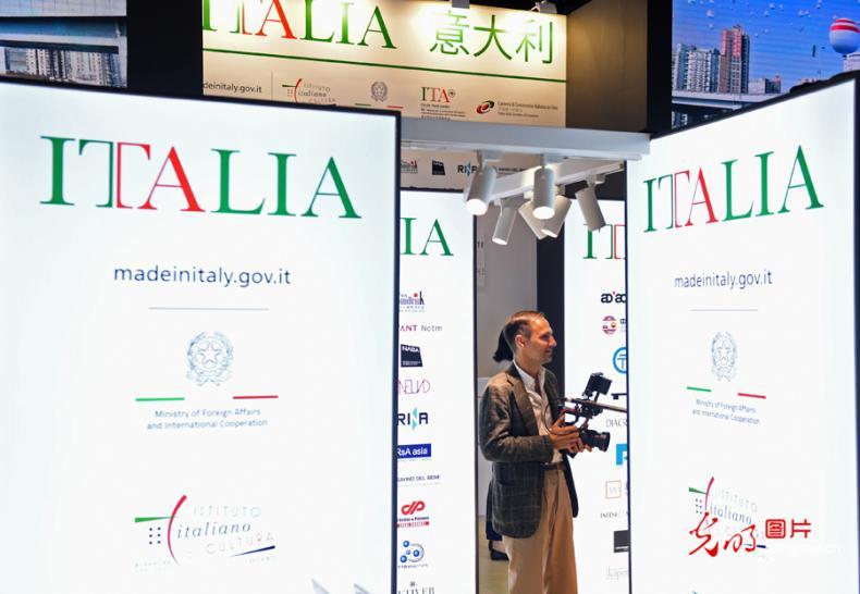 9月3日,國家會議中心綜合展區(qū)意大利展館,一名外國媒體在拍攝報道。(光明網(wǎng)記者 潘迪攝/光明圖片)
