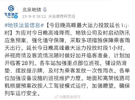 據(jù)北京地鐵官博消息,為應(yīng)對(duì)今日晚高峰降雨,地鐵公司及時(shí)啟動(dòng)防汛應(yīng)急預(yù)案,強(qiáng)化值守保障,采取多項(xiàng)措施保障乘客雨天出行。延長(zhǎng)今日晚高峰最大運(yùn)力投放時(shí)段1小時(shí),并視雨情及客流情況隨時(shí)做好加開(kāi)臨客準(zhǔn)備,計(jì)劃加開(kāi)臨客28列。各車站加強(qiáng)重點(diǎn)部位巡視,鋪設(shè)防滑墊、擺放提示牌,及時(shí)為乘客發(fā)放一次性雨衣。各單位加強(qiáng)設(shè)備設(shè)施的巡視維護(hù)力度。地面和高架線路司機(jī)根據(jù)預(yù)案改按人工駕駛模式運(yùn)行,加強(qiáng)瞭望,確保列車運(yùn)行安全。