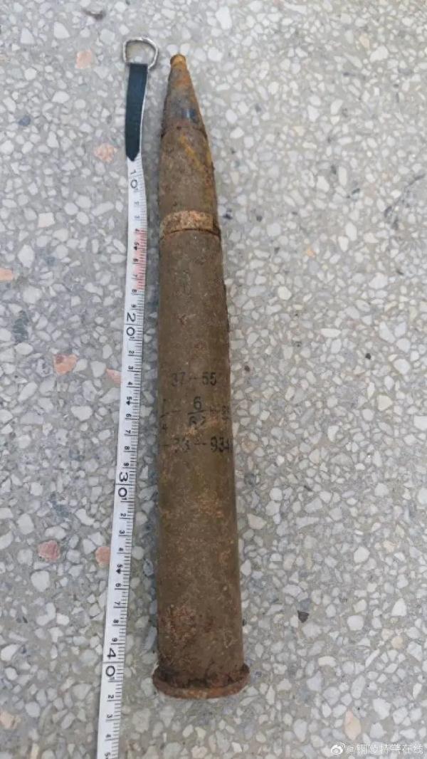 銅陵特警在線提供圖片顯示,該炮彈長約40cm。